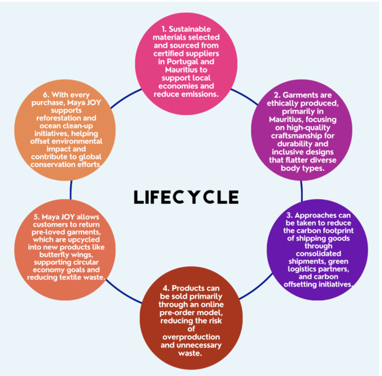 Maya JOY commits to responsible consumption and production by embedding sustainability into every stage of its operations. Recognising the fashion industry’s significant role as a major global polluter, Maya JOY prioritises ethically sourced materials and actively reduces waste through upcycling initiatives, transforming pre-loved garments into new designs and creative projects like children’s butterfly wings.